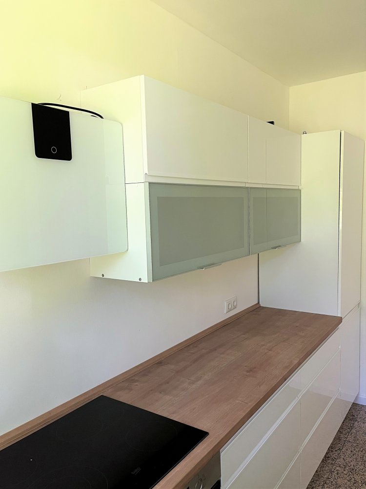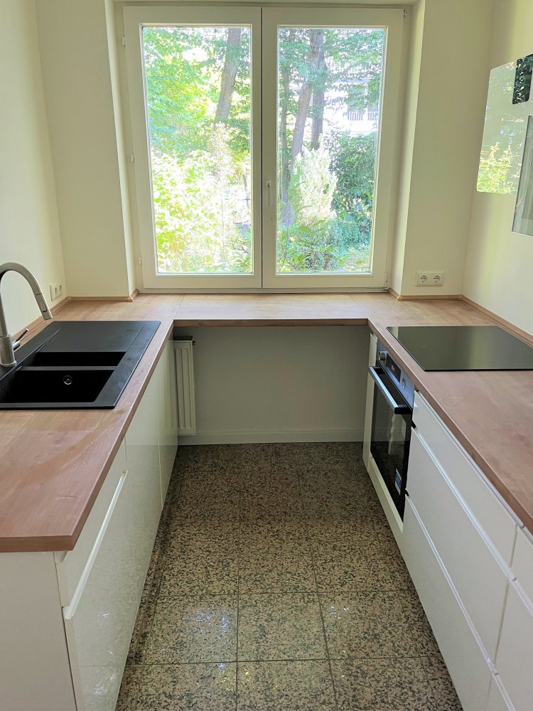 Dann werden Sie sicherlich den optimal nach Südwesten ausgerichteten Garten genießen, den Kindern beim Spielen zuschauen oder mit Freunden auf der Terrasse mit elektrischer Markise grillen. Und auch das Haus hat natürlich viel zu bieten. Auf allen Etagen kann man sich am warmen Holzton der Parkettböden erfreuen und nahezu sämtliche Räume sind hell und von der Sonne verwöhnt. Beginnen wir mit dem geräumigen Wohnzimmer, in dem auch problemlos ein Essbereich platziert werden kann. Hier kommt beim Blick auf den Kamin Vorfreude auf den Winter und ein prasselndes Kaminfeuer auf. Durch den gut nutzbaren Flur und am modernen Gäste-WC vorbei gelangen wir in die Küche. Diese ist vollständig möbliert und mit Ceranfeld, Backofen, Abzugshaube, Spülmaschine sowie mit einem großen Einbaukühlschrank ausgestattet.