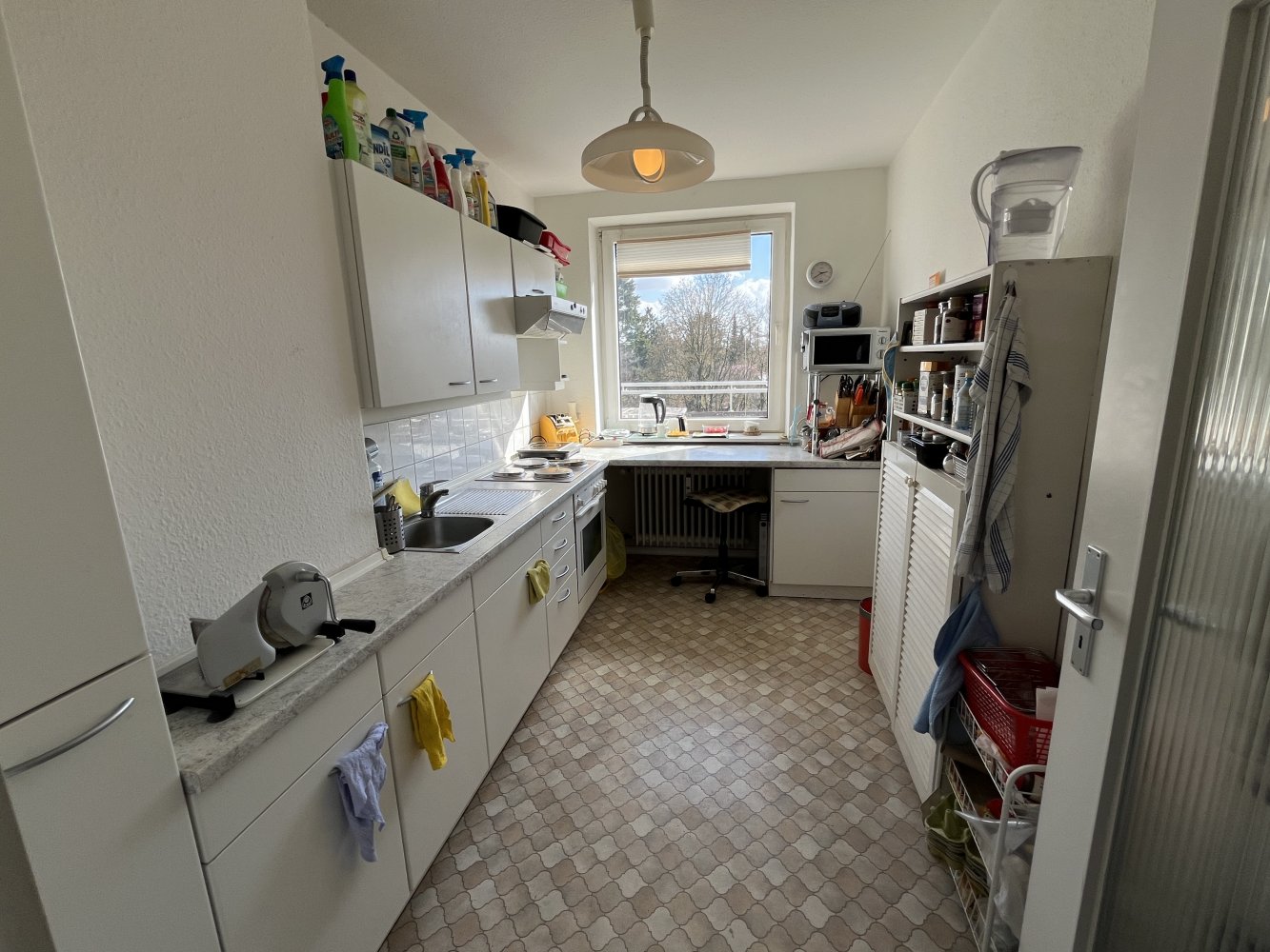 Über den Flur mit einem praktischen Einbauschrank erreicht man das angrenzende Bad. Es stammt noch aus dem Baujahr und verfügt über eine Wanne und einen Stellplatz für die Waschmaschine Ihres Mieters. Das vorhandene Fenster sorgt für eine gute Belichtung und Belüftung. Abschließend schauen wir in die Küche, die mit einer zur Wohnung gehörenden Einbauküche ausgestattet ist.