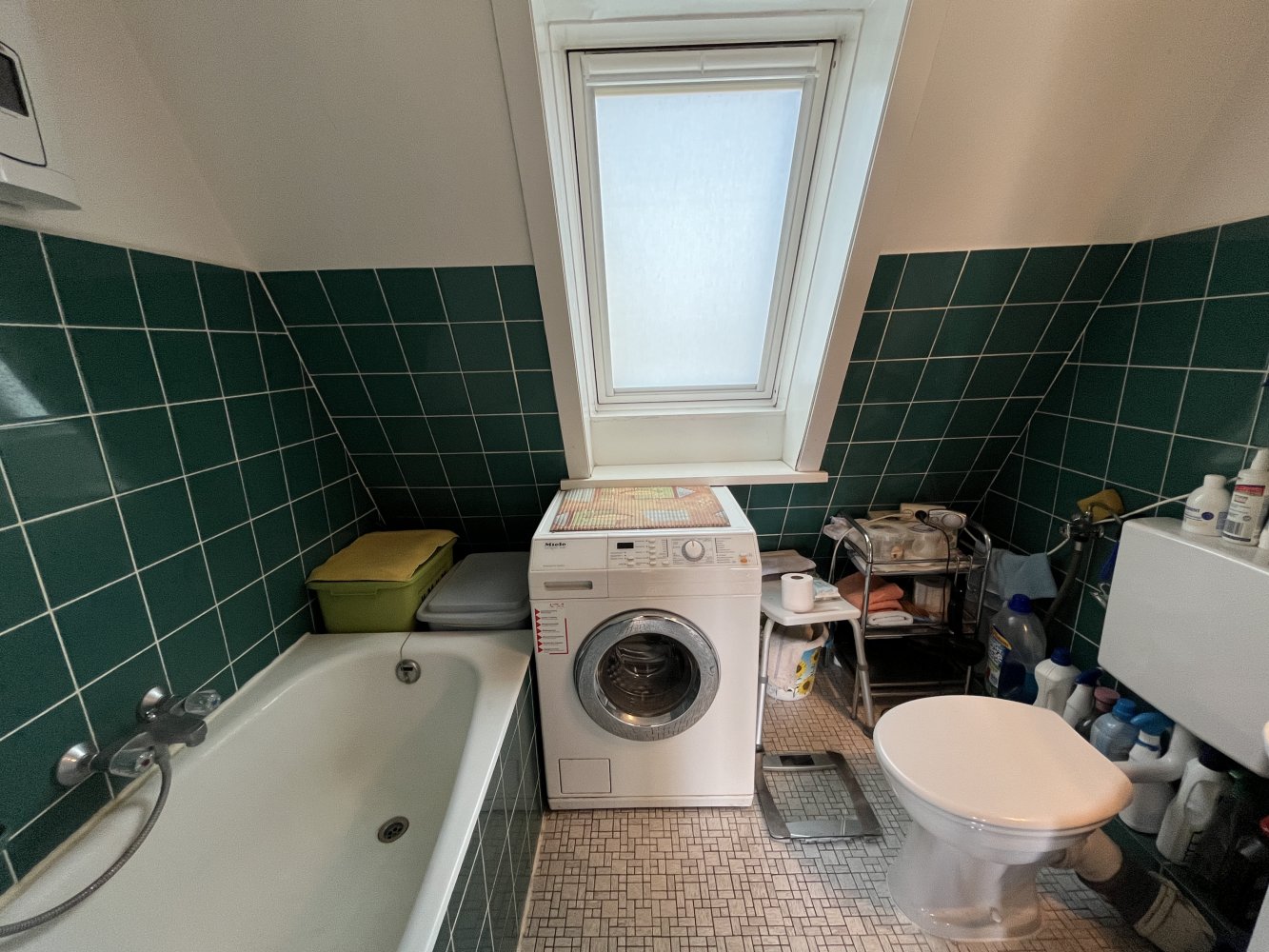 Über den Flur mit einem praktischen Einbauschrank erreicht man das angrenzende Bad. Es stammt noch aus dem Baujahr und verfügt über eine Wanne und einen Stellplatz für die Waschmaschine Ihres Mieters. Das vorhandene Fenster sorgt für eine gute Belichtung und Belüftung. Abschließend schauen wir in die Küche, die mit einer zur Wohnung gehörenden Einbauküche ausgestattet ist.